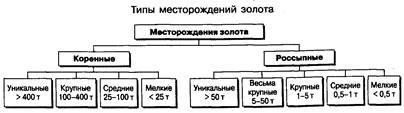 При естественном разрушении золотосодержащих пород коренных месторождений образуются вторичные месторождения, или россыпи — скопления разрыхленных частиц горных пород. По величине запасов россыпные месторождения также подразделяются на уникальные, весьма крупные, крупные, средние и мелкие (схема 1).