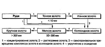 Этот круговорот начинается с выветривания золотосодержащих пород (медно-нике-левых, колчеданных, медно-цинковых и ар-сенопиритовых сульфидных руд) под воздействием температуры, кислорода, углекислого газа и воды. Этому способствуют и различные микроорганизмы, роль которых сводится к выщелачиванию золота из руд.