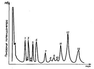 на хроматограмме в определенном порядке появляются пики индивидуальных соединений. Xpoматограмма - совокупность пиков, соответствующая порядку выхода и массе индивидуальных компонентов смеси. Порядок выхода при хроматографическом разделении ТМС-производных зависит от жидкой фазы. Его устанавливают предварительно для данной фазы с использованием модельных ТМС-производных чистых моносахаридов по их времени удерживания. На рис. приведена в качестве примера хроматограмма модельной смеси, разделенной на колонке с метилхлорфенил-силиконовым маслом в качестве жидкой фазы.