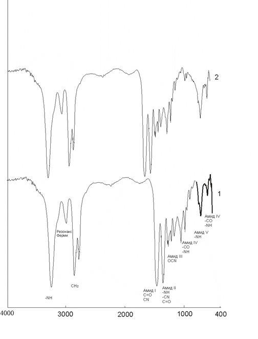 Рис.3. ИК-спектры: 1 – синтезированного ПКА;