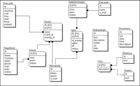 Сущность «Заказы» и связанная с ней сущность «Описание» определяют атрибуты необходимые для описания заказов. Атрибут client_id и manag_id необходимы для связывания сущности «Заказы» с сущностями «Клиент» и «Менеджер». Сущность «rights» необходима для назначения прав и областей доступа для менеджера и администрации. Сущность «Администрация» и связанная с ней сущность «Описание» содержит атрибуты для описания администратора системы. Атрибуты«User», «pass» и «status» необходимы для авторизации и аутентификации пользователя в системе.