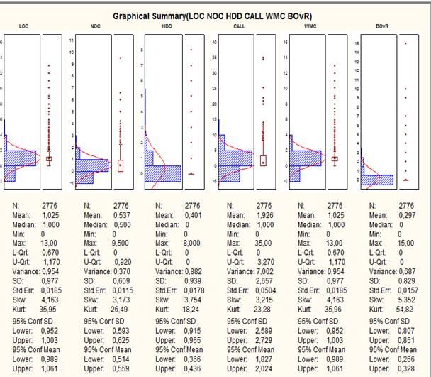 Мал.5. Проведений статичний аналіз за допомогою Statistica для метрик LOC, NOC, HDD, CALL, WMC та BOvR