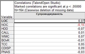 У таблиці 6 приведено обчислення коефіцієнта кореляції кожної метрики проекту TalendOpen Studio 3.2.1 відносно однієї з властивостей ПЗ, а саме супроводжуваності програмного продукту.