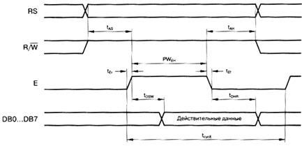 В соответствии с временной диаграммой в исходном состоянии сигнал Е = 0, сигнал R/W = 0, значение сигнала RS - произвольное, шина данных DBO...DB7 в состоянии высокого импеданса (НI). Такое состояние управляющих сигналов (E и R/W) должно поддерживаться все время в промежутках между операциями обмена с ЖКИ-модулем. Шина данных в эти моменты в принципе свободна, и может использоваться в мультиплексном режиме для каких-либо других целей, например, для сканирования матрицы клавиатуры. Естественно, необходимо позаботиться об исключении конфликтов на шине данных в момент совершения операций обмена с ЖКИ-модулем.
