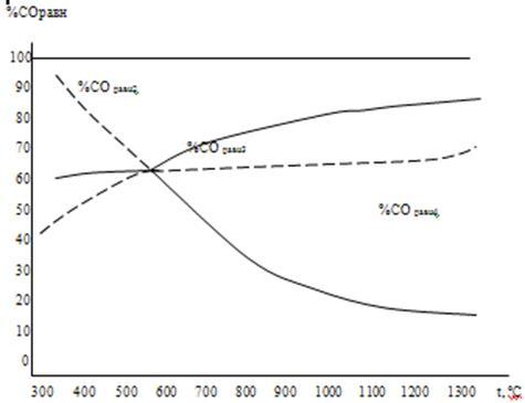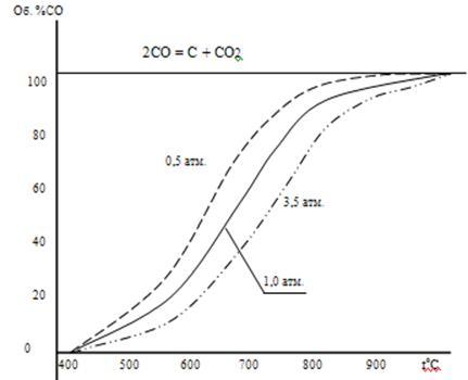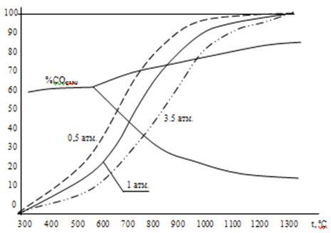 В трехкомпонентной системе Fe – C – O равновесие четырех фаз (три твердых + газ) одновариантно (С=К-f + n = 3 – 4 +2 = 1) , т.е. состав газа и температура определяются давлением. При Р= const C=0 и равновесие возможно лишь при единственном значении температуры. Равновесное значение температуры можно найти как координату точки пересечения кривой %CОравн = φ(t) на рис. 3 с изобарой реакции Ств + СО2