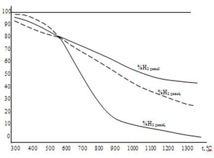 Равновесный состав газа в реакциях восстановления оксидов железа водородом и СО приведен на рисунках 3-6. На всех по оси ординат представлен объемный процент газа восстановителя, поэтому поле каждого рисунка, кроме рис.6, ограничено сверху асимптотой %В = 100.