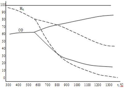 Сравнение диаграмм равновесного состава газа в реакциях восстановления оксидов железа водородом и монооксидом углерода представлено на рис. 5 и 6. Для всех оксидов железа равновесные кривые восстановления водородом и монооксидом углерода пересекаются при температуре 810о