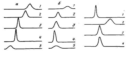 нпэк=7,0. Это объясняется протеканием реакции (2), которая приводит к образованию нового НПЭК, состав которого отличается от φ=0,45. Сравнение седиментограмм показывает, что коэффициент седиментации вновь образовавшегося НПЭК* такой же, как для полученного специально ЛПЭК (φ =0,23), совпадают также площади пиков этих двух седиментограмм (концентрация ЛПЭ в этих растворах одна и та же). Последнее убедительно свидетельствует о том, что реакция (2) полностью завершается. Вполне аналогичные явления наблюдаются и при смешении растворов НПЭК, образованных одной и той же парой полиэлектролитов, но имеющих разные составы. Нами изучена реакция между НПЭК nMANa — ПВП составов φ =0,45 и φ =0,2. На рис. 3 приведены седиментограммы исходных НПЭК состава φ =0,45 и φ =0,2, смеси равных количеств этих растворов, содержащих ЛПЭ в одинаковых концентрациях, а также раствора НПЭК состава φ =0,33, полученного смешением полимерных реагентов в кислых средах с последующим переводом системы в растворимое состояние введением NaOH. НПЭК получены из тех же полиэлектролитов nMANa и ПВП, что и использованные в предыдущих опытах.
