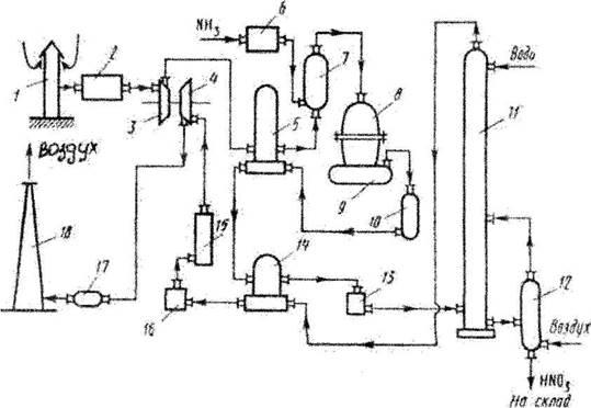 1-воздухозаборная труба; 2-воздухоочиститель; 3-газовый компрессор; 4-газовая турбина; 5-воздухоподогреватель; 6-испаритель аммиака; 7-смеситель с фильтром; 8-контактный аппарат; 9,17-котёл-утилизатор; 10-окислитель с фильтром; 11-абсорбционная колонна; 12-отдувочная колонна; 13-холодильник-конденсатор; 14-подогреватель хвостовых газов; 15-реактор каталитической очистки; 16-камера сгорания; 18-выхлопная труба.