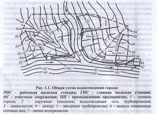 Схемы водоотведения населенных пунктов разрабатывается на генплане городов в масштабе 1:5000-1:20000 с горизонталями через 1-2 м с указанием кварталов и проездов, схемы водоотведения промышленных предприятий – на генплане в масштабе 1:1000-1:5000 с горизонталями через 0,5-1 м. На рис. 1.1 показана общая схема водоотведения города.