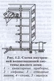 На рис.1.2 показана схема внутренней водоотводящей сети жилого дома. Она состоит из приемников сточных вод внутренней водоотводящей сети, которая включает водоотводящие линии, стояки и выпуски из здания.