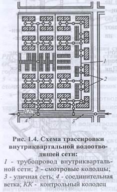 Внутриквартальная водоотводящая сеть представляет собой систему подземных трубопроводов (рис. 1.4). Трассировка ее производится около зданий между смотровыми колодцами по концам выпусков из зданий в направлении, совпадающим с уклоном поверхности земли. Соединение ее с внешней сетью производится участками труб, называемыми соединительными ветками. Внутриквартальная сеть трубопроводов рассчитывается на самотечное движение жидкости с частичным заполнением труб.