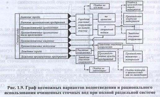 На рис. 1.9 показан граф возможных вариантов водоотведения и рационального использования очищенных сточных вод при полной раздельной системе. Из рис. 1.9 видно, что эта совершенная система водоотведения обеспечивает рациональное использование как воды, так и осадков, и надежно защищает окружающую среду от загрязнения.