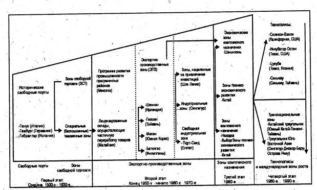 По мере усиления конкурентной борьбы основным фактором конкурентоспособности становится не цена товара, а его качество, новизна, наукоемкость, многие экспортопроизводственные зоны стали трансформироваться в научно-промышленные парки. Кроме того, новые СЭЗ образуются в форме технополисов – высокоразвитых структур по организации разработки и выпуска конкурентоспособной продукции. Особым видом СЭЗ являются оффшор – центры. В них концентрируется банковский, страховой бизнес, через них осуществляются экспортно-импортные операции, операции с недвижимостью трастовая и консалтинговая деятельность'. Таким образом, постоянно идет процесс эволюции зон – от свободного порта до технополиса, и это движение вперед продолжается.