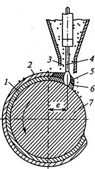 2 — шлаковая корка; 3 — флюс; 4 — электрод; 5 — расплавленный флюс; 6 — расплавленный металл; 7— основной металл; е — смещение электрода с зенита
