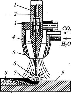 1 — мундштук; 2 — электродная проволока; 3 —горелка; 4 — наконечник; 5 — сопло горелки; 6 — электрическая дуга; 7 — сварочная ванна; 8 — наплавленный металл; 9 — наплавляемая деталь