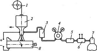 1 — кассета с проволокой; 2 — наплавочный аппарат; 3 — расходомер; 4 — редуктор; 5 — осушитель; 6 — подогреватель; 7 — баллон с углекислым газом; 8 — деталь