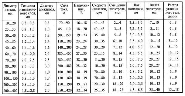 Режимы наплавки, выполняемой на цилиндрических деталях, приведены в табл. 6.