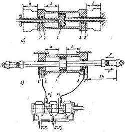 Для устранения этих явлений, когда они нежелательны, такие гидроцилиндры включают при помощи золотника по дифференциальной схеме (см. позиции I и II), при которой штоковая полость 8 непрерывно соединена с питающей линией 9. Если при этом S’=S/2, то при движении вправо (позиция золотника I) и влево (позиция золотника II) скорость v=Q/S’ и сила F=pS’ будут одинаковы. Для получения полной симметрии сил и скоростей применяют гидроцилиндры с двусторонним штоком (рис. 2) с одним внутренним 1 и двумя 2 и 3 наружными уплотнениями. В этом случае конструкция с закрепленным штоком (рис. 2. а) в полтора раза короче, чем конструкция с закрепленным цилиндром (рис. 2. б)