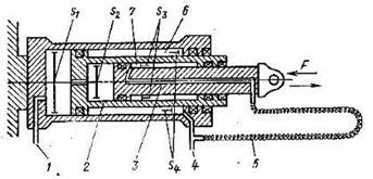 Телескопические гидроцилиндры (рис. 4) применяют в случаях, когда желаемый ход превышает допустимую установочную длину гидроцилиндра. Выдвижение секций цилиндра, если он питается через линию 1 от источника постоянного расхода Q будет происходить с разными скоростями и, если преодолеваемая сила F постоянна, при разных давлениях.