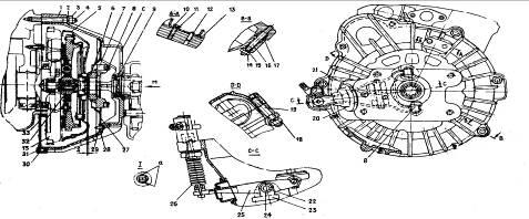 1 – картер сцепления, 2 – шайба; 3 – гайка; 4 – шпилька крепления картера сцепления; 5 – кожух в сборе с нажимным диском; 6 – подшипник выключения сцепления; 7 – обойма подшипника; 8 – соединительное звено; 9 – сальник в сборе; 10 – болт крепления кожуха; 11 – шайба; 12 – установочный штифт кожуха сцепления; 13 – маховик; 14 – гайка; 15 – шайба; 16 – шпилька крепления картера сцепления; 17 – штифт установочный трубчатый картера сцепления; 18 – гайка; 19 – шпилька крепления стартера и картера сцепления; 20 – чехол грязезащитный; 21 – винт крепления кронштейна вилки; 22 – ось вилки; 23 – кронштейн вилки; 24 – втулка вилки; 25 – вилка выключения сцепления; 26 – пружина оттяжная вилки; 27 – щиток в вентиляционный; 28 – штифт: 29 – гайка пластинчатая крепления вентиляционного щитка; 30 – шайба; 31 – болт крепления грязезащитного щитка; 32 – ведомый диск в сборе; 33 – щиток грязезащитный.
