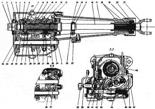 1 – вал первичный; 2 – кольцо стопорное; 3 – подшипник роликовый; 4 – кольцо; 5 – гайка; 6 – шайба пружинная; 7 – шайба стопорная; 8 – шестерня III передачи; 9 – шайба распорная; 10 – шестерня II передачи; 11 – шестерня заднего хода (муфта включения I и II передач); 12 – сухарь синхронизатора: 13 – шестерня I передачи; 14 – шестерня – ведущая привода спидометра; 15 – шарик стопорной шестерни; 16 – вал вторичный: 17 – удлинитель; 18 – втулка биметаллическая; 19 – сальник внутренний: 20 – сальник наружный; 21 – вилка скользящая; 22 – кронштейн задней опоры двигателя; 23 – редуктор спидометра; 24 – шайба упорная; 25 – втулка шестерен; 26 – ступица; 27 – пружина; 28 – трубка распорная: 29 – ось блока: 30 – блок шестерен промежуточного вала: 31 – муфта включения III и IV передач; 32 – кольцо блокирующее; 33 – иглы блока: 34 – кольцо упорное игл; 35 – шайба передняя упорная блока; 36 – шестерня паразитная заднего хода; 37 – ось паразитной шестерни; 38 – рычаг переключения; 39 – переключатель передач; 40 – пружина фиксатора вилок; 41 – шарик фиксатора; 42 – стержень вилок; 43 – вилка переключения передач; 44 – стопор осей: 45 – валик переключения заднего хода; 46 – вилка включения заднего хода; 47 – крышка люка шестерни заднего хода; 48 – картер.