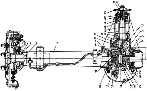 1 – пластина крепления подшипника; 2 – втулка упорная; 3 – подшипник заднего колеса; 4 – втулка запорная подшипника; 5 – манжета полуоси; 6 – полуось; 7 – картер заднего моста; 8 – шайба пружинная; 9 – болт крепления редуктора; 10 – картер редуктора; 11 – шестерня ведомая: 12 – шестерня ведущая; 13 – подшипник ведущей шестерни задний; 14 – прокладки регулировочные; 15 – втулка распорная; 16 – прокладки регулировочные; 17 – подшипник ведущей шестерни передний; 18 – шайба маслоотражательная; 19 – манжета ведущей шестерни; 20 – фланец крепления карданного вала с грязеотражателем в сборе; 21 – шайба; 22 – гайка; 23 – штифт пальца сателлитов; 24 – коробка дифференциала; 25 – подшипник дифференциала; 26 – гайка регулировочная; 27 – стопор; 28 – шайба пружинная; 29 – болт крепления стопора; 30 – шестерня полуоси; 31 – сателлит; 32 – палец сателлитов; 33 – пробка маслоналивного отверстия; 34 – шайба пружинная; 35 – болт крепления ведомой шестерни; 36 – крышка подшипников дифференциала; 37 – шайба опорная.