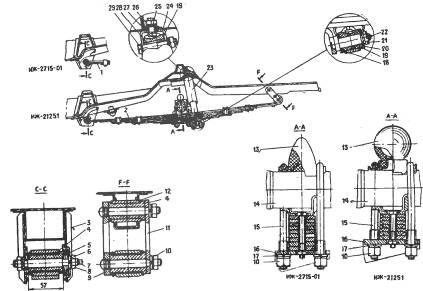 1 – рессора ИЖ – 2715 – 01; 2 – Рессора ИЖ – 21251; 3 – кронштейн передний; 4 – втулка резиновая ушков рессоры; 5 – шайба сферическая; 6, 17, 25 – шайбы пружинные; 7 – палец передний рессоры; 8, 10, 26 – гайки; 9 – щека серьги с пальцами в сборе; 11 – щека серьги; 12 – втулка заднего кронштейна; 13 – буфер задней подвески; 14 – картер заднего моста; 15 – стремянка; 16 – пластина стремянки; 18,20 – обоймы; 19 – втулка резиновая; 21 – гайка прорезная; 22 – шплинт; 23 – амортизатор; 24 – кронштейн амортизатора; 27, 29 – болты; 28 – втулка распорная.