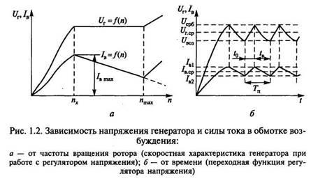 Зависимости силы тока возбуждения и напряжения генератора от времени показаны на рис.1.2, б. Время t0, в течение которого резистор отключен, с ростом частоты вращения уменьшается, а время /в, в течение которого он включен, увеличивается.