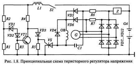 По способу управления тиристором тиристорные регуляторы напряжения можно разделить на регуляторы с управлением угла включения тиристора (системы с естественной коммутацией) и регуляторы с управлением относительной длительностью включения тиристора (системы с искусственной коммутацией). На рис.1.8. приведена принципиальная схема тиристорного регулятора напряжения с естественной коммутацией. В регуляторе напряжения функции регулирующего органа выполняет тиристор VS. В анодную цепь тиристора включена обмотка возбуждения ОВ генератора. Обмотка возбуждения шунтируется диодом VD4. Чтобы обеспечить естественную коммутацию, тиристор подключен к генератору через однофазный двухполупериодный выпрямитель, образованный двумя диодами выпрямителя генератора и двумя вспомогательными диодами VD5, VD6. Для обеспечения возбуждения генератора к обмотке возбуждения подводится напряжение аккумуляторных батарей через резисторы R6nR7. Для улучшения условий коммутации тиристора применен конденсатор С1.