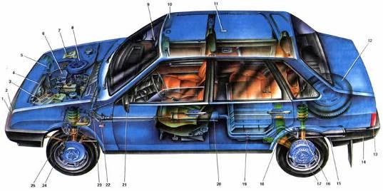 Общее устройство автомобилей ВАЗ 21099 показано на рисунке: