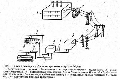 На тяговой подстанции напряжение понижается до 600 В и переменный ток преобразуется, выпрямителями в постоянный. По питающим линиям положительной и отрицательной полярности 7 электроэнергия подается в контактные провода 8 трамвая 9 или контактные провода троллейбуса 10. Подвижной состав трамваев и троллейбусов получает электроэнергию через контакт токоприемников с контактным проводом, в трамвае второй контакт осуществляется через колесные пары и рельсы.