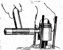 4. Надеть поршень на верхнюю головку шатуна штифтами в сторону выхлопного окна. Совместить отверстия бобышек поршня и подшипника верхней головки шатуна при помощи оправки, придерживая поршень рукой, легкими ударами молотка запрессовать палец. Установить второе стопорное кольцо.