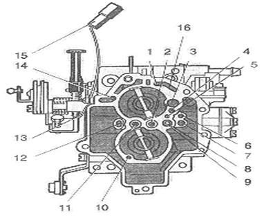 1 - гвинт регулювання складу суміші на неодруженому ходу; 2 - щілинний перехідний отвір; 3 - отвір забору повітря, що емульсує, в систему неодруженого ходу: 4 - головний паливний жиклер первинної камери; 5 - емульсивний колодязь головної дозуючої системи первинної камери; 6 - перехідний отвір вторинної камери; 7 - паливний жиклер перехідної системи вторинної камери; 8 - повітряний жиклер перехідної системи; 9 - проти-дренажний отвір; 10 - повітряний жиклер системи неодруженого ходу; 11 - отвір паливного жиклера неодруженого ходу; 12 - паливний жиклер системи неодруженого ходу; 13 - голка клапана з пластмасовим наконечником; 14 - електромагнітний клапан; 15 - емульсивний канал.
