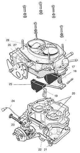 1 - діафрагма пускового пристрою; 2 - повітряні жиклери головних дозуючих систем на емульсивних трубках; 3 - гвинт регулювання складу суміші на неодруженому ходу; 4 - важіль приводу прискорювального насоса; 5 - вісь важеля прискорювального насоса; 6 - діафрагма прискорювального насоса; 7 - блок рідинного підігрівання вихідних каналів системи холостого ходу; 8 - штуцер системи вентиляції картера; 9 - вісь дросельної заслінки первинної камери; 10 - жиклер економайзера; 11 - діафрагма вакуумного економайзера; 12 - клапан економайзера; 13 - кільцеве ущільнення на топливозаборной трубці системи холостого ходу; 14 - електромагнітний клапан; 15 - топливоподводящий штуцер; 16 - топливоотводящий штуцер; 17 - пробка порожнини паливного фільтру; 18 - корпус голчаного клапана поплавцевої камери; 19 - тримач розпилювачів прискорювального насоса; 20 - малі дифузори; 21 - гвинт-упор важеля дросельної заслінки; 22 - вісь дросельної заслінки вторинної камери; 23 - наполегливий гвинт важеля дросельної заслінки; 24 - дріт датчика закритого положення дросельної заслінки; 25 - поплавці; 26 - важіль осі повітряної заслінки; 27 - шток діафрагмового механізму повітряної заслінки; 28 - повітряна заслінка; А, Би - похила і вертикальні частини каналу системи холостого ходу; Д - заглушки каналів.