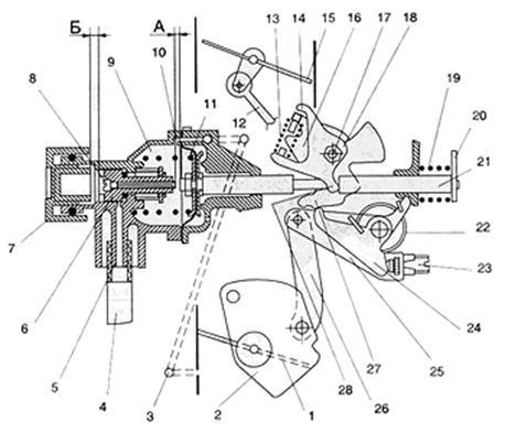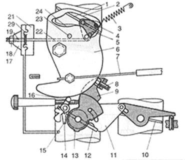 1 - повітряна заслінка;2, 23 - відповідно верхня і нижні частини профільованого вирізу важеля;3 - пружина;4 - штифт;5 - важіль осі повітряної заслінки;6 - кулачок;7 - трос управління пусковим пристроєм;8 - гвинт регулювання величини прочинена дросельної заслінки в період пуску;9 - важіль на осі дросельної заслінки первинної камери;10 - дросельна заслінка вторинної камери;11 - проміжний важіль;12 - дросельна заслінка первинної камери;13 - виступ важеля осі дросельної заслінки первинної камери;14 - вусик блокуючого важеля;15 - важіль блокування;16 - штифт блокуючого важеля;17 - кришка;18 - контргайка;19 - гвинт-упор;20 - діафрагма; 21 - корпус діафрагмового механізму пускового пристрою;22 - шток; 23 - фіксатор.