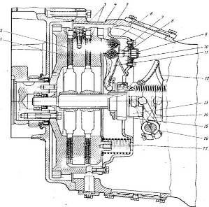 1 — маховик; 2,5 — соответственно диски ведущие средний и нажимной; 3 — диски ведомые; 4 — картер; 6 — кожух; 7 — вилка оттяжного рычага; 8 — шайба стопорная; 9 — гайка регулировочная; 10 — пластина запорная; // — рычаг оттяжной; 12 — шланг муфтывыключения сцепления; 13 — муфта выключения сцепления; 14 — вилка выключения сцепления; 15 — кольцо оттяжных рычагов упорное; 16 — вал вилки; 17 — пружина нажимная