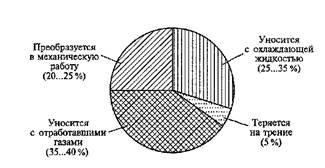 теплоемкость и поэтому отводят теплоту от стенок цилиндров двигателя менее интенсивно. Так, при охлаждении антифризом температура стенок цилиндров на 15...20°С выше, чем при охлаждении водой. Это ускоряет прогрев двигателя и уменьшает изнашивание цилиндров, но в летнее время может привести к перегреву двигателя. Оптимальным температурным режимом двигателя при жидкостной системе охлаждения считается такой, при котором температура охлаждающей жидкости в двигателе составляет 80 ...100 °С на всех режимах работы двигателя. Это возможно при условии, что с охлаждающей жидкостью уносится в окружающую среду 25...35 % теплоты, выделяющейся при сгорании топлива в цилиндрах двигателя. При этом в бензиновых двигателях величина отводимой теплоты больше, чем в дизелях. На рис. 10 приведена диаграмма распределения теплоты, выделяющейся при сгорании топлива в цилиндрах двигателей автомобилей при жидкостной системе охлаждения. Из диаграммы следует, что в механическую работу преобразуется 20...35% теплоты, уносится с отработавшими газами 35...40%, теряется на трение 5 % и уносится с охлаждающей жидкостью 25...35 % теплоты.