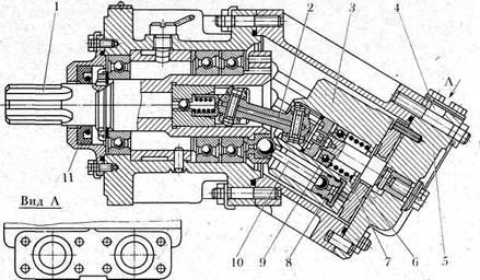 Нерегульований Аксіально-поршневий насос-гідромотор з похилим блоком (Рис. 3.3.). Блок 3 циліндрів одержує обертання від вала 1 через універсальний шарнір 2. Вал приводиться в рух від двигуна і спирається на три шарикопідшипника. Поршні 8 зв'язані з валом штоками 10, кульові голівки яких завальцовані у фланцевій Частині вала. Блок циліндрів, що обертається на шарикопідшипнику 9, розташований стосовно вала під кутом 30° і притиснутий пружиною 7 до розподільного диска 6, що цим же зусиллям притискається до кришки 5, через вікна в якій підводиться і приділяється робоча рідина. Манжетне ущільнення 11 у передній кришці перешкоджає витоку олії з неробочої порожнини насоса.