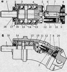 Аксіально-поршневі регульовані і нерегульовані насоси і гідромотори, широко застосовувані на вітчизняних екскаваторах, відрізняються уніфікованою конструкцією секції, що качає, (Рис. 3.4, а). Опорами ведучого вала 1 служать три шарикопідшипника: два радіально-упорних 13 і один радіальний 14. Від осьового переміщення внутрішні кільця підшипників утримуються двома пружинними кільцями 15, втулкою 3 і запірним кільцем 2. У передній кришці 16 установлене манжетне ущільнення 17, що спирається на втулку 18. У сферичні гнезда фланця вала входять сім шатунів 11, що разом з центральним шипом 5 притиснуті до фланця вала штампованою пластиною 4. На шипі штифтом 10 зафіксований блок 7 циліндрів, зовнішня поверхня якого спирається на розподільний диск 8. Опорами шипа служать з однієї сторони сферична голівка, а з іншого боку - бронзова, втулка 9, запресована в диск. Усередині блоку циліндра знаходяться сім поршнів 12, завальцованных на шатунах. Попереднє притиснення блоку циліндрів до диска досягається тарілчастими пружинами 6.