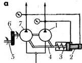 а - гідравлічна схема, б -загальний вид; 1, 7 – поворотні корпуси, 2 - золотник,