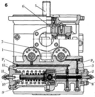 На екскаваторах ЭО-3322Д, ЭО-3323, ЭО-4321А, ЭО-4121Б и ЭО-4124 установлені регульовані аксіально-поршневі насоси, що складаються з двох уніфікованих секцій, що качають, змонтованих в одному корпусі. Такі насоси (Рис. 3.5.) використовують для створення двох потоків робочої рідини. Повне використання потужності приводного двигуна забезпечується за допомогою убудованого сумматора потужності, який розподіляє потужність між споживачами таким чином, що сума цих потужностей залишається постійної і рівної встановленої потужності приводу. Вал 5 (Рис. 3.5, а) одержує обертання від приводного двигуна і через редуктор 6 передає рух валам секцій, що качають.