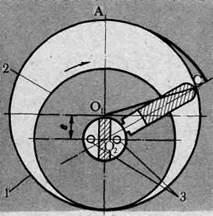 Радіально-поршневі насоси (рис, 3.6.) і гідромотори. Основою насоса є кривошипно-повзунковий механізм, у якого роль шатуна виконує статор 1, співвісний осі а циліндри зроблені в роторі 2. При обертанні ротора навколо осі Ог, що має стосовно осі О ексцентриситет е, поршень робить обертальний Рух разом з ротором і зворотно-поступальний рух щодо ротора.