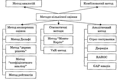 Для кількісного визначення кредитного ризику використовується метод "коефіцієнтного аналізу" і метод рейтингів. Метод "коефіцієнтного аналізу" полягає в експертному аналізі та зіставленні економічних коефіцієнтів, які характеризують кредитоспроможність і фінансовий стан контрагента, із середніми показниками відповідної групи банків за визначений часовий період. Відповідно до методу рейтингів, кожен банк за певною методикою розраховує рейтинг і робить висновок про кредитоспроможність та фінансовий стан контрагента.