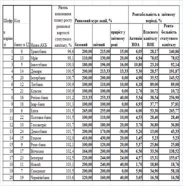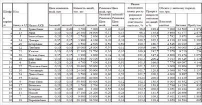 Об’єктом статистичного аналізу є умовна вибірка показників діяльності 20 комерційних банків в базовому та звітному роках, а також показники вартості їх акцій на фондовому ринку в базовому та звітному роках.