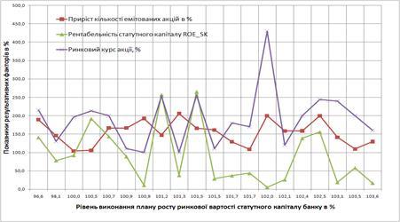 Коефіцієнт рентабельності статутного капіталу ROE_SK визначає норму дивідендної доходності номінальної вартості акції банку при коефіцієнті розподілу чистого прибутку на дивіденди 1,0. Фактичний коефіцієнт розподілу прибутку до виплати доходів по акціях в комерційних банках знаходиться на рівні 0,3 – 0,4. Згідно з формулою (1.2), коефіцієнт рентабельності статутного капіталу ROE_SK визначає ринковий курс акції, тобто перевищення її продажної ціни на фондовому ринку над номіналом.