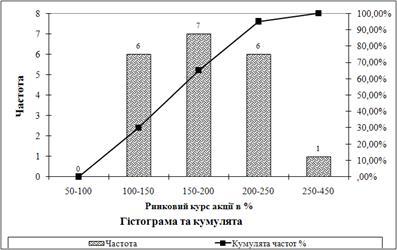 3.2 Графіки розподілу банків за рентабельністю статутного капіталу банку та ринковим курсом акцій (гістограма, полігон, кумулята)