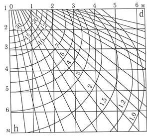 Значення е, як правило, береться з графіка просторових ізолюксів умовного горизонтального освітлення світильників (рис. 2.1). За відсутності ізолюксів для даного світильника розрахунок проводиться за просторовими ізолюксами умовного горизонтального освітлення зі силою світла світильника 100 кд. При цьому