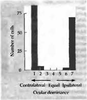 Сначала результаты подобных опытов разочаровывали: после нескольких месяцев зрение в обоих глазах оперированного животного оставалось нормальным, и Хьюбель и Визелъ уже были готовы прекратить эту напряженную серию экспериментов (личное сообщение). Тем не менее они смогли получить следующие данные о работе корковых клеток. Отдельные корковые клетки имели нормальные рецептивные поля и живо отвечали на определенным образом ориентированные стимулы. Однако почти каждая клетка отвечала только на стимуляцию одного глаза, некоторые управлялись правым, некоторые — левым, но практически ни одна — обоими глазами. Клетки, как обычно, были сгруппированы в колонки по отношению к глазному предпочтению и к ориентации оси зрительного поля. Как и ожидалось, возникала атрофия в области ЛКТ, хотя колончатая архитектура слоя 4 оставалась без изменений. Почти полное отсутствие бинокулярного представления в коре показано на гистограмме, полученной от обезьяны с искусственно вызванным косоглазием (рис. 2). Критический период для смещенного (из-за косоглазия) восприятия, в течение которого возникают данные изменения, близок к критическому периоду монокулярной депривации.