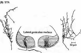 Рис. 4. Эффект подавления электрической активности тетродотоксином на ветвистость нервных волокон глазного нерва, заканчивающихся в ЛКТ. (А) У нормального котенка окончания зрительного нерва, помеченные при помощи пероксидазы хрена, ограничены пределом того слоя, где они в норме заканчиваются. (В) После применения тетродотоксина на протяжении 16 дней в эмбриональном возрасте, помеченные аксоны имеют гораздо большую ветвистость и не ограничены всего лишь одним слоем.